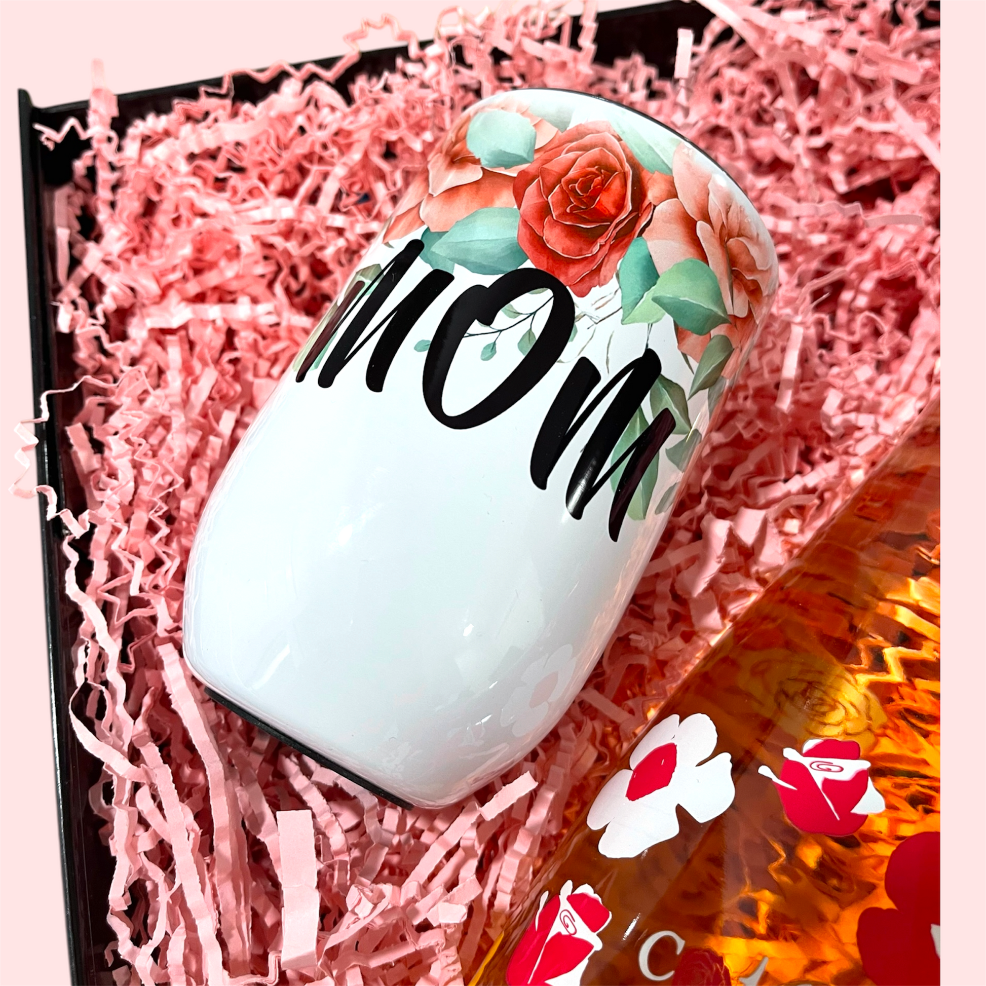 Inside, she’ll find a beautiful “Mom” wine tumbler, perfect for enjoying her favorite glass in comfort and style, paired with a stunning bottle of Côte des Roses Rosé. This isn’t just any bottle of wine — the base of the bottle is elegantly shaped like a rose, making it a keepsake she’ll love long after the last pour.