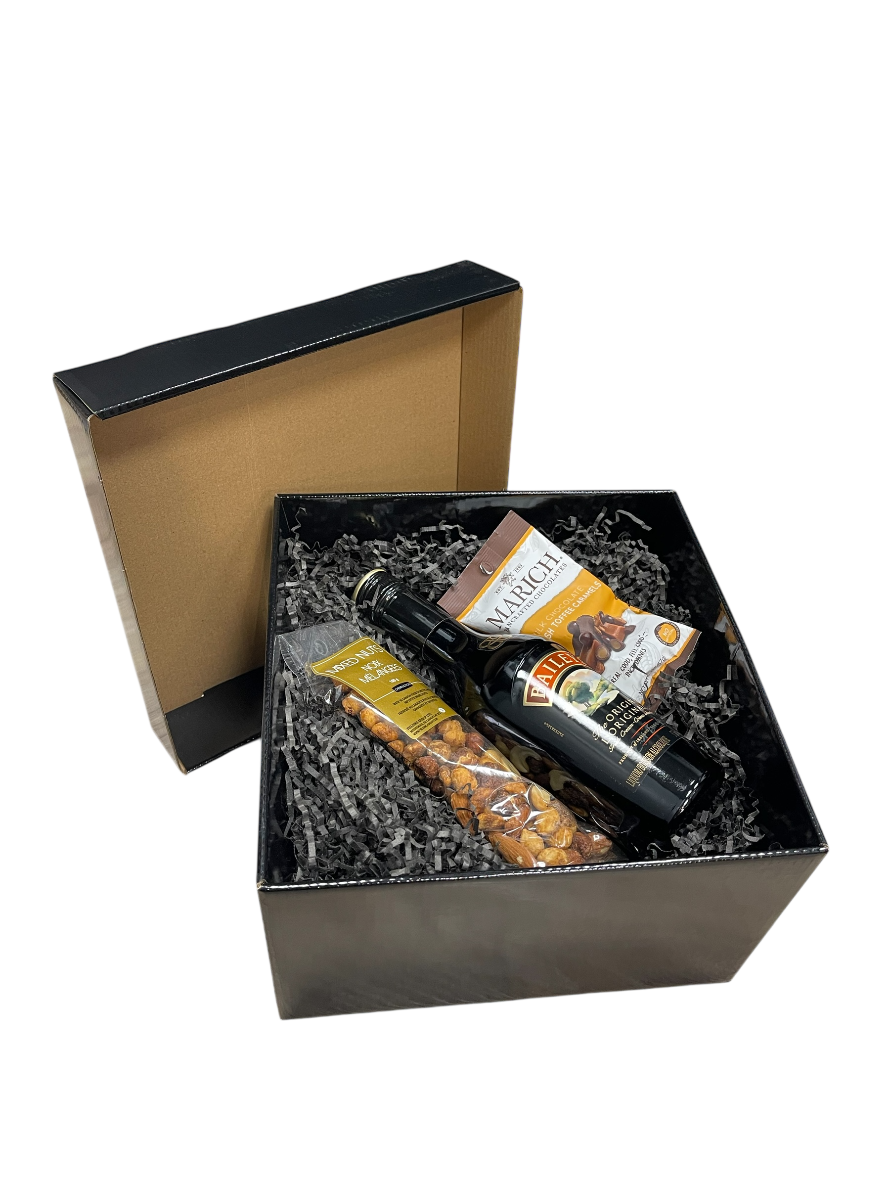 Give the gift of Little Luxuries. This elegant 375ml gift box pairs a premium half-sized bottle with carefully selected gourmet treats, all nestled in sleek black packaging.